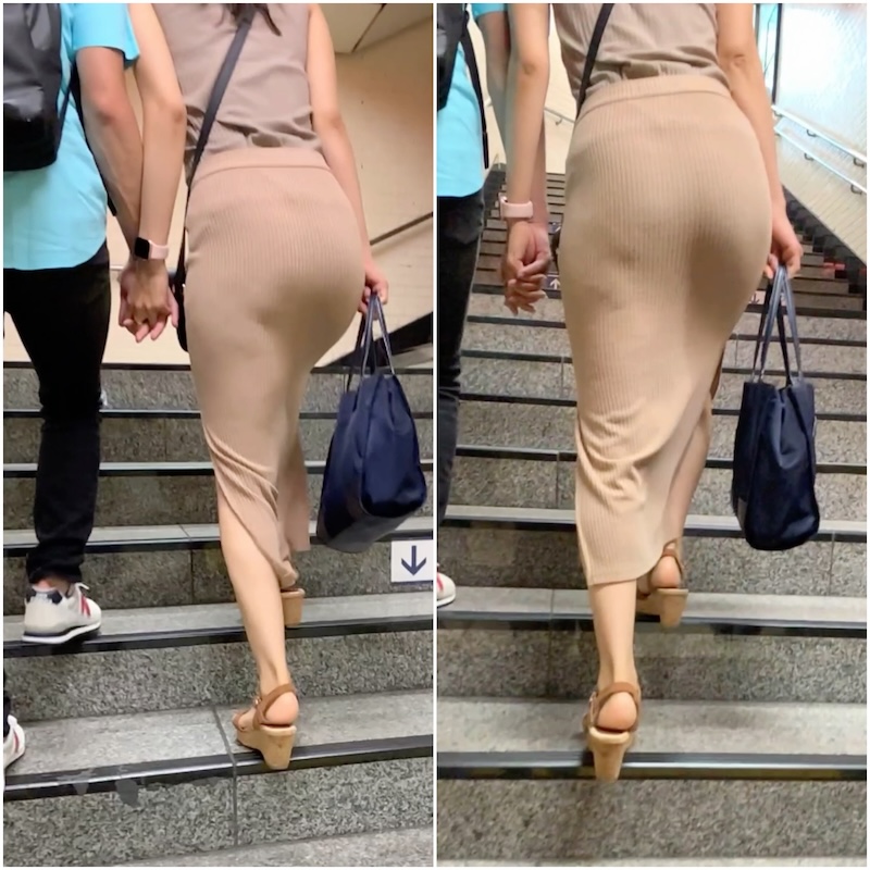 ピッチピチでスリット入りのニットスカート姿。