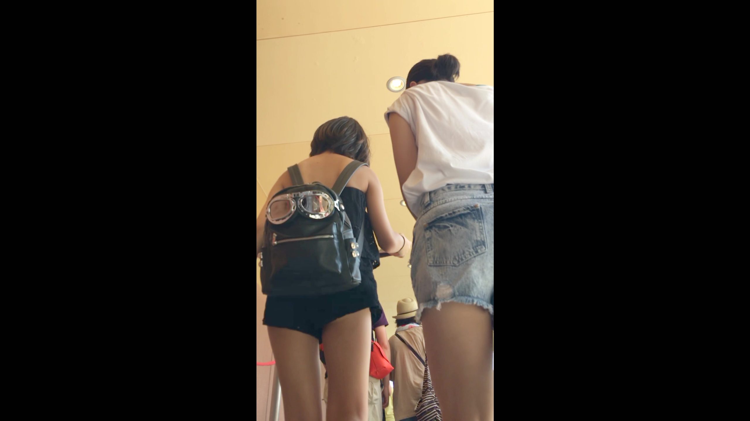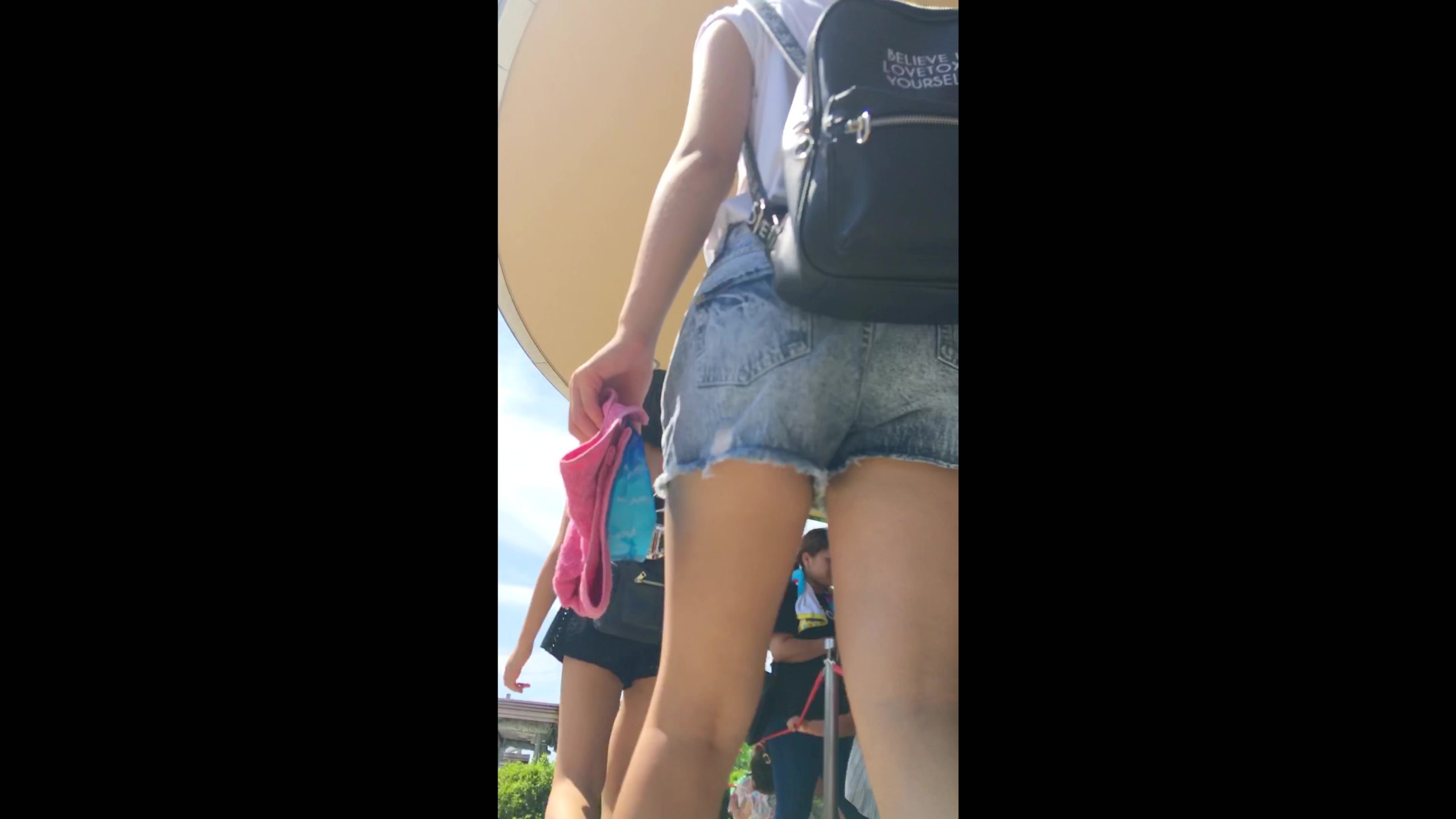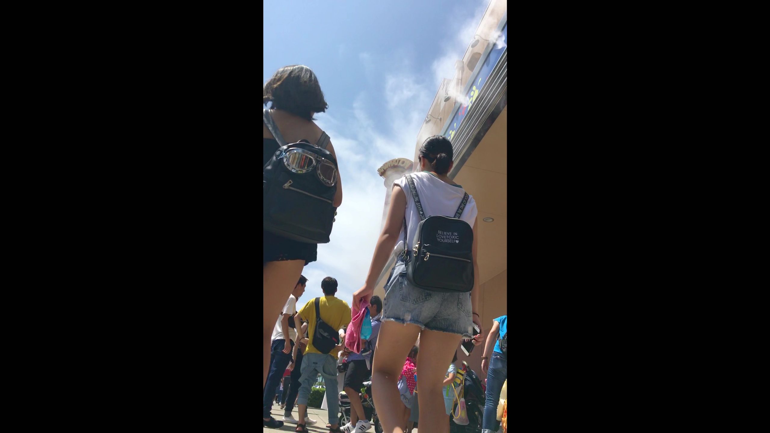 テーマパークで順番待ちしているC二人組のローアングルです!