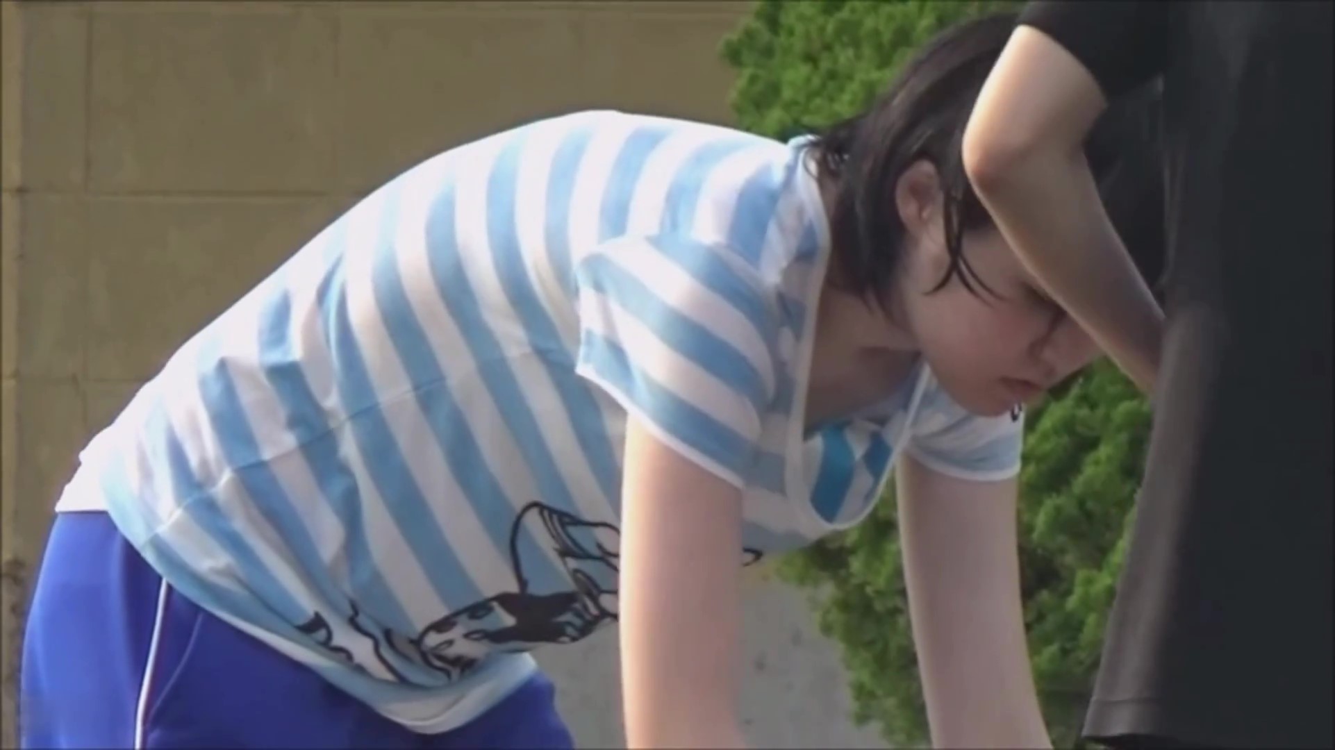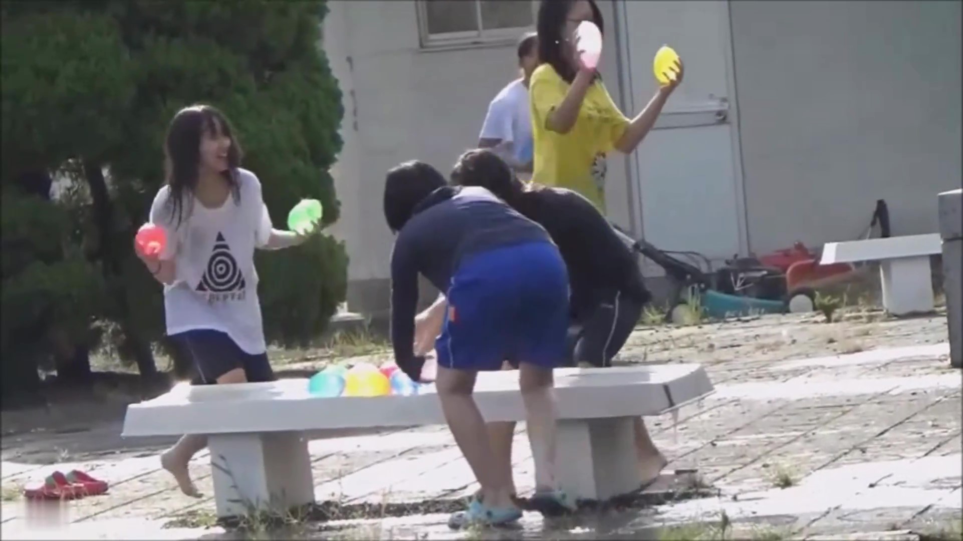 水風船を投げ合うJ〇の女の子。Tシャツの隙間から見える胸元にドキドキです!